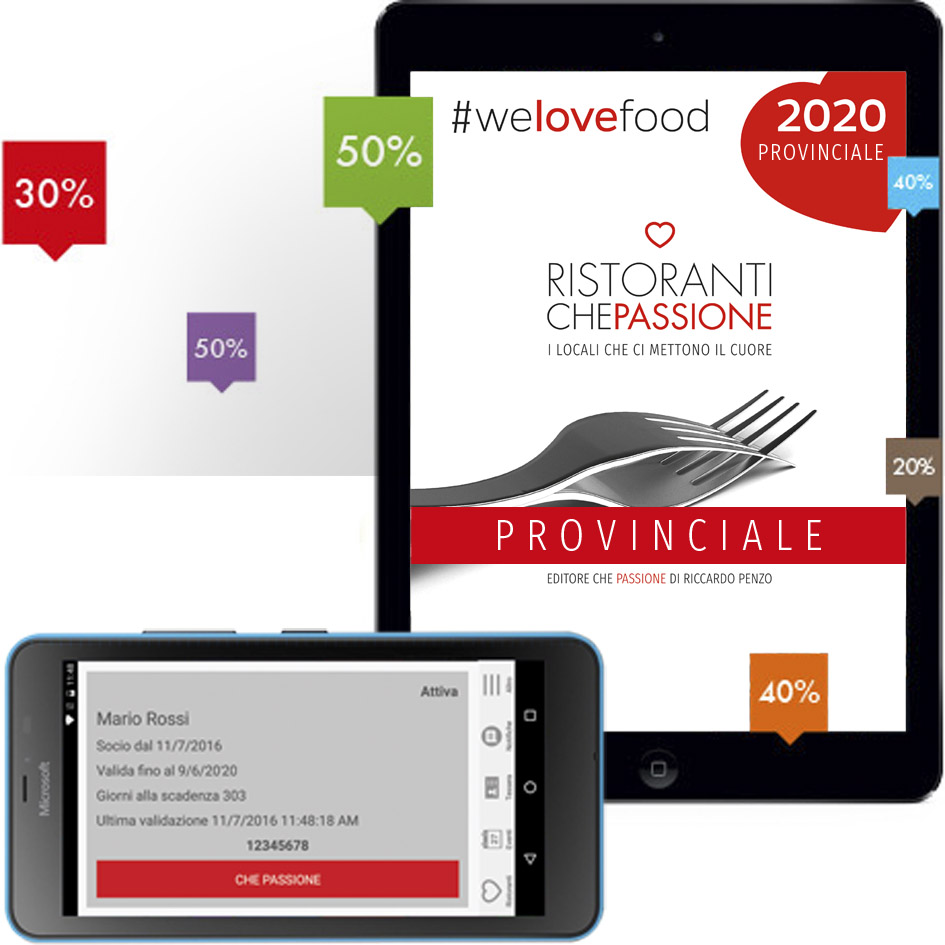 Grazie alla Card Ristoranti Che Passione inclusa accedi alle promozioni dal 20 al 50% sul cibo per due persone, in tutti i locali che aderiscono al progetto. Sulla Guida e nell’App gratuita, nella scheda di ogni ristorante, sono indicate le promozioni Che Passione offerte nei diversi casi. Per approfondire il funzionamento della Card Che Passione e delle promozioni offerte clicca qui.